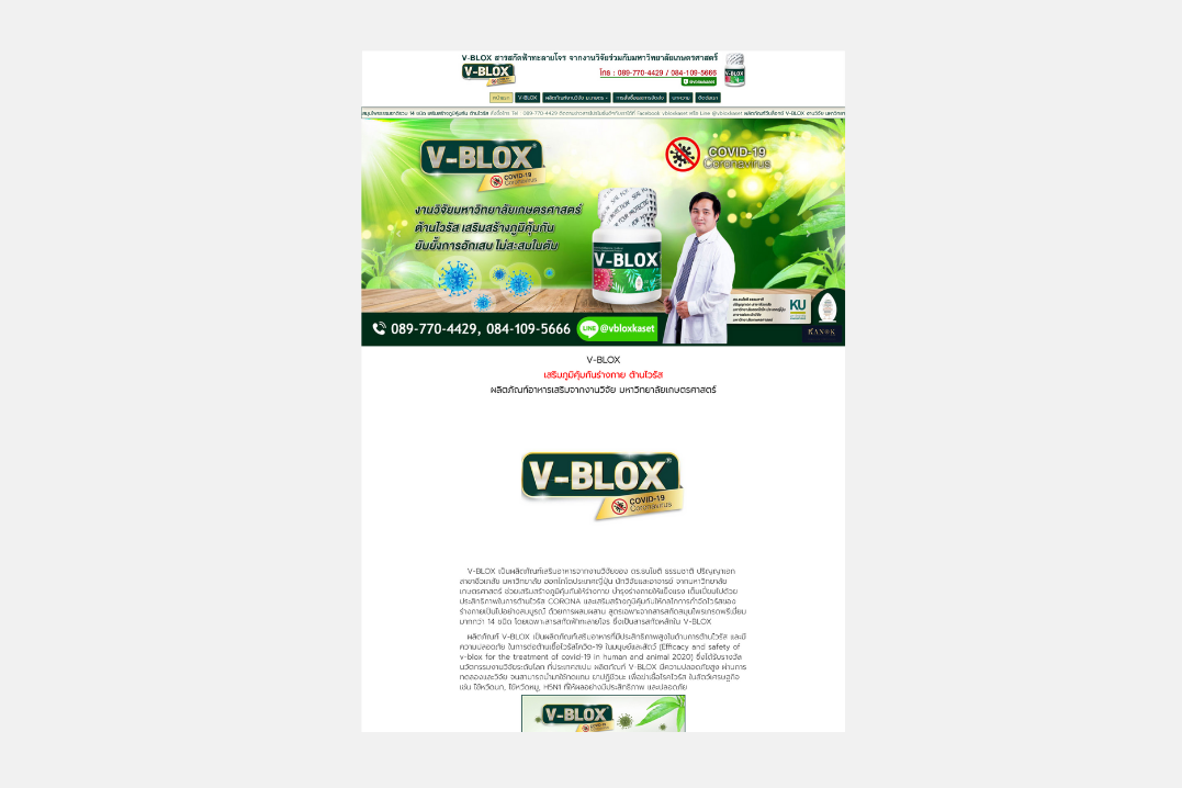 V-BLOX เป็นผลิตภัณฑ์เสริมอาหารจากงานวิจัยของ ดร.ธนโชติ ธรรมชาติ ปริญญาเอกสาขาชีวเภสัช มหาวิทยาลัย ฮอกไกโดประเทศญี่ปุ่น นักวิจัยและอาจารย์ จากมหาวิทยาลัยเกษตรศาสตร์ ช่วยเสริมสร้างภูมิคุ้มกันให้ร่างกาย บำรุงร่างกายให้แข็งแรง เต็มเปี่ยมไปด้วย ประสิทธิภาพในการต้านไวรัส CORONA และเสริมสร้างภูมิคุ้มกันให้กลไกการกำจัดไวรัสของร่างกายเป็นไปอย่างสมบูรณ์ ด้วยการผสมผสาน สูตรเฉพาะจากสารสกัดสมุนไพรเกรดพรีเมี่ยม มากกว่า 14 ชนิด โดยเฉพาะสารสกัดฟ้าทะลายโจร ซึ่งเป็นสารสกัดหลักใน V-BLOX